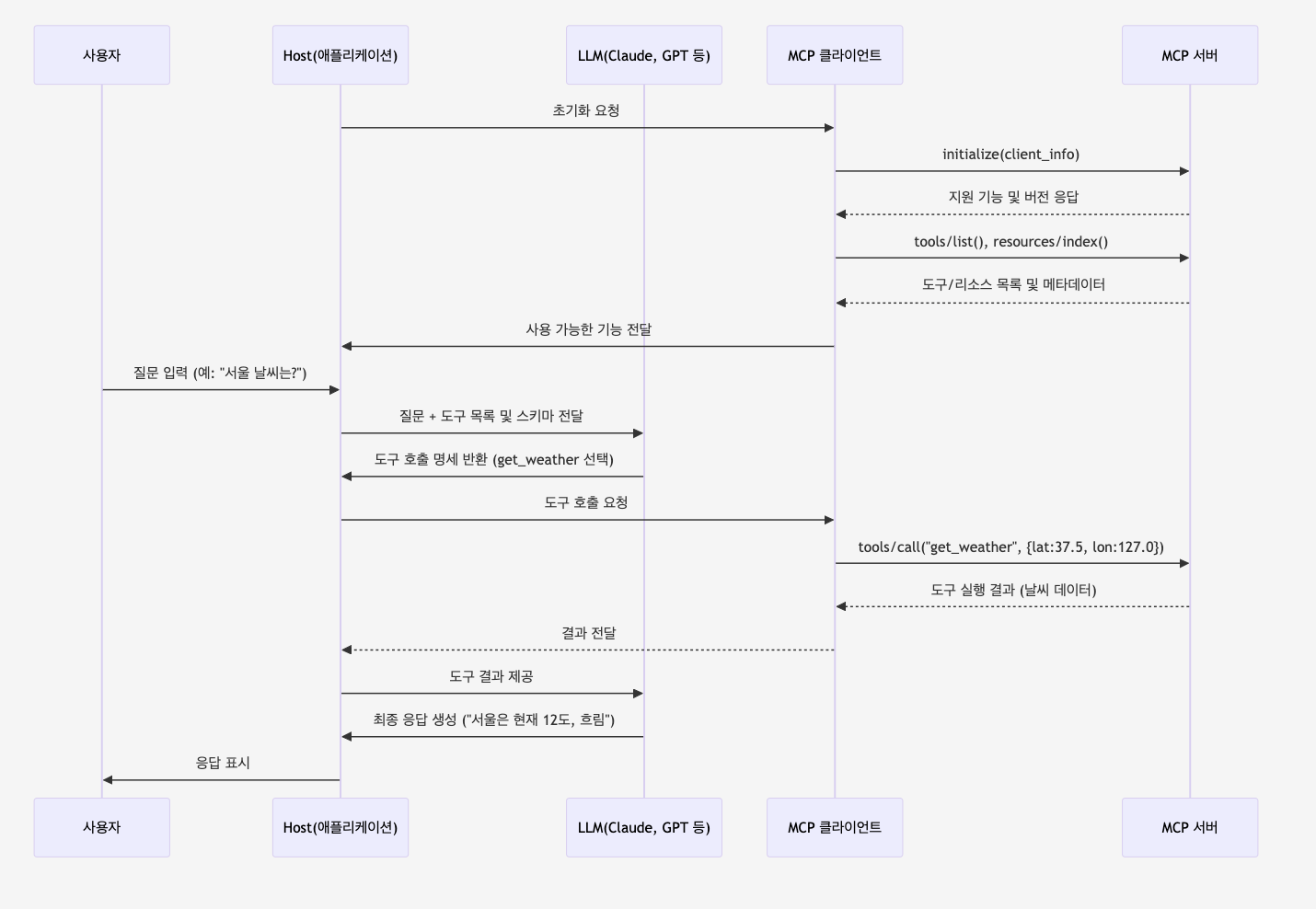 서버가 제공하는 도구(예: 날씨 조회, 캘린더 등)를 클라이언트가 받아서 LLM에 제공한다.