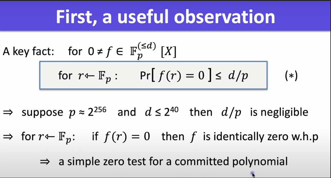- 쉽게 말하면, f(x)가 0이 아닌 다항식이라면, 임의로 선택된 값 r에서 f(r)이 0이 될 확률이 매우 낮다는 뜻입니다. d는 다항식의 차수이고, p는 유한체의 크기이기 때문에, 체의 크기가 커질수록 이 확률은 더욱 작아집니다.