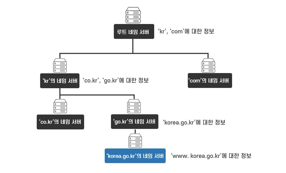 1단계 TLD 네임 서버는 .com, .org, .net 등과 같은 최상위 도메인 이름을 관리, 각 도메인에 속하는 네임 서버의 정보를 가지고 있음2단계 중간계층 SLD 에는 도메인 이름을 관리하는 네임 서버들이 위치한다. 조직의 속성을 구분하는 'co'(영리 기업), 'go'(정부 기관), 'ac'(대학)과 같은 도메인3단계 조직이나 서비스의 이름을 나타내는 도메인 이름으로 도메인 사용자가 원하는 문자열을 사용www ftp mail