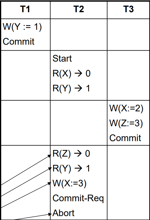 T3 에서 x에 락을 걸고 쓰기 수행 , T2에서도 락을 얻을 수는 있지만 이미 변경되어있는 변수에 대해서 락을 얻는 것은 의미가 없다.