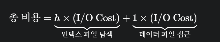 여기서 h 만큼 I/O cost 하고, 거기서 실제 레코드(Primary)를 1개 찾고(Key는 1개의 값만 가진다) 그 레코드를 읽고 I/O Cost가 나온다.