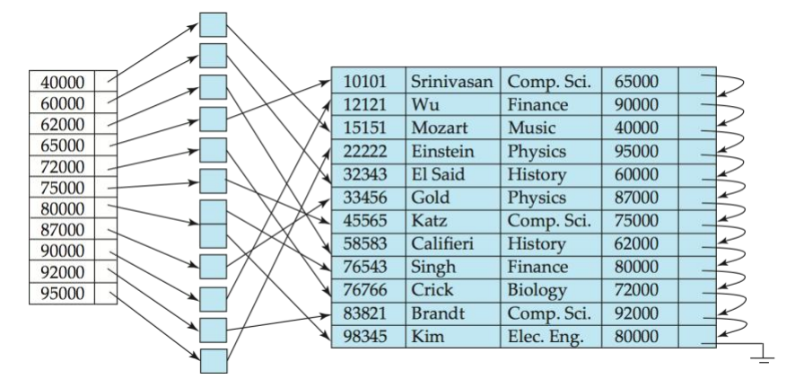 Dense Index 형태: 보조 인덱스는 모든 레코드를 가리키며, 하나의 키 값에 여러 레코드가 대응될 수 있습니다.