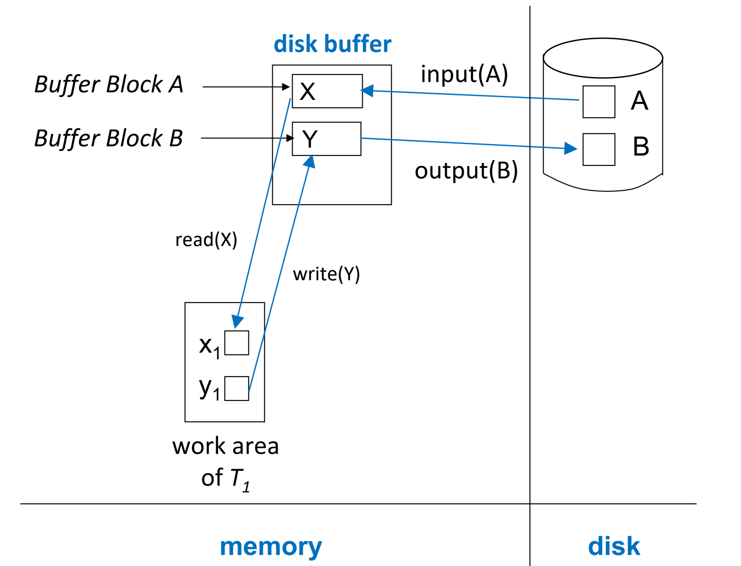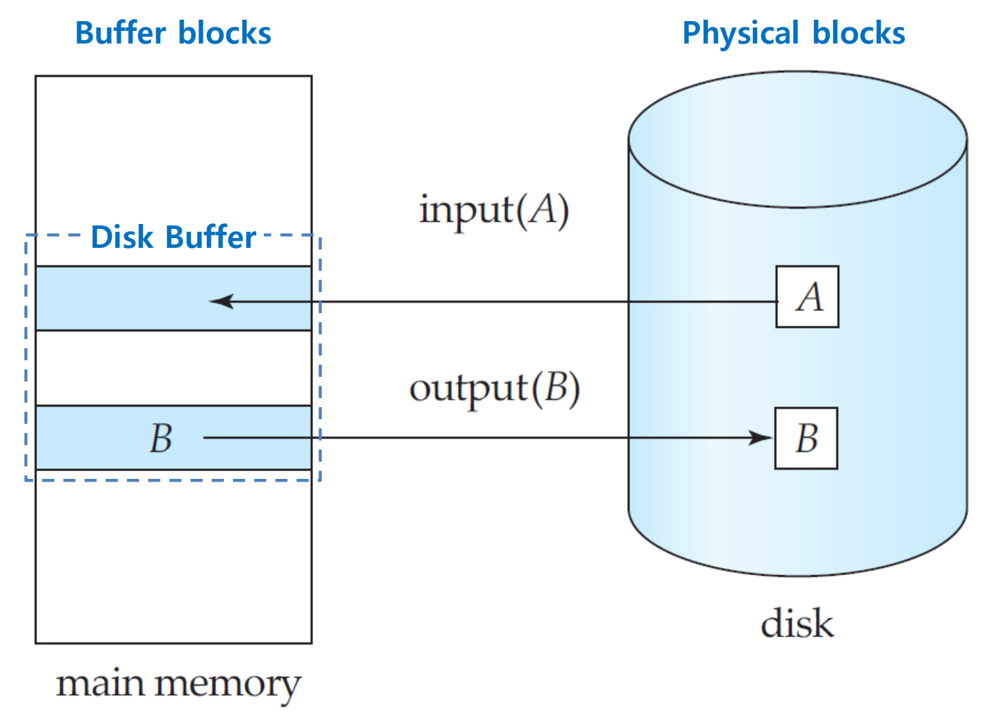 ◦ `output(B)`: 버퍼의 블록 B를 디스크로 이동 및 덮어쓰기
