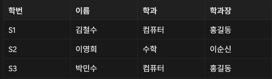 정규화 규칙(3NF)은 “비-프라임 속성(여기선 학과장)이 PK(학번)에 직접 종속”되어야 한다고 요구하므로 분해 대상이 된다.