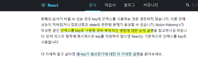 - key값에 고유 id를 넣어주면, 배열의 중간에 어떤 요소가 삽입되더라도 기존에 있는 원소들이 가지고 있는 key가 끊어질 위험이 없다.