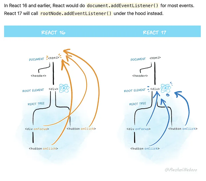 17이하 버전에서는 컴포넌트에 상위 document에 Listener를 붙였지만,React 17부터는 document가 아닌 Native Event를 Listen하고, 그 이벤트에 따라 ‘알맞는 타겟의 핸들러를 찾아서 실행시키는’ 핸들러를 포함한 Lisnener를 root에 등록시킨다