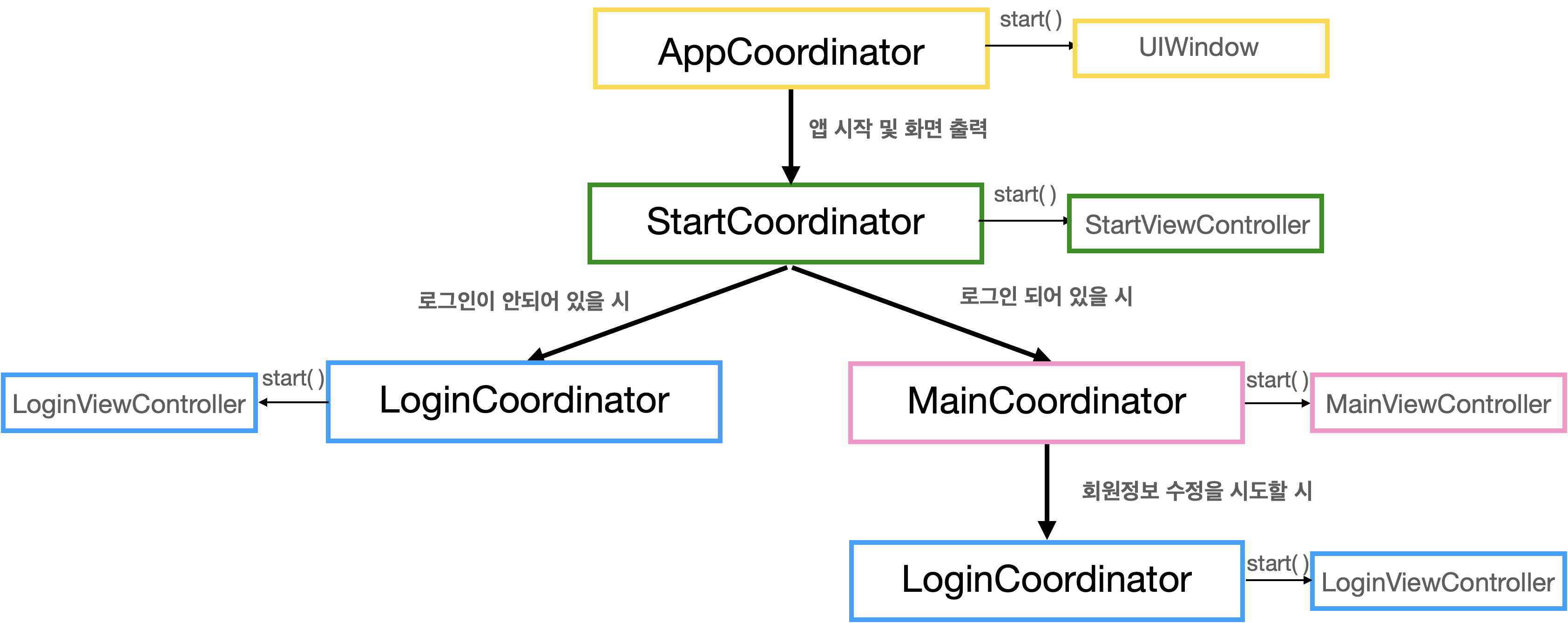 위와 같은 구조를 Coordinator로 구성한다 하면 아래와 같이 변경될 것이다.
