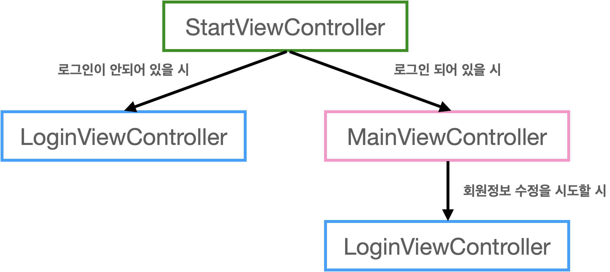 앱에 진입하면 StartViewController가 나타나고, 로그인이 안되있을 경우 LoginViewController로, 로그인되어 있을 경우 MainViewController로 화면이 전환된다.