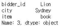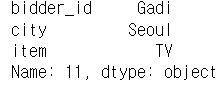 주의, loc[11]에서 11은 레이블 이름이므로 인덱스 번호와는 구분된다. 데이터프레임 생성시 set_index("bid_id")를 통해서 bid_id를 레이블 이름으로 지정한 것이다.