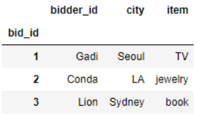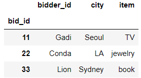 "item": ["TV", "jewelry", "book"]}).set_index("bid_id")