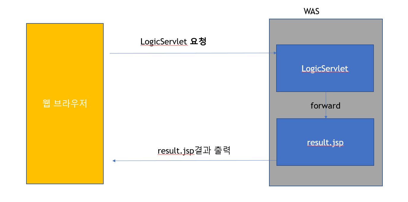 Servlet은 프로그램 로직이 수행되기에 유리하다. IDE 등에서 지원을 좀 더 잘해준다.JSP는 결과를 출력하기에 Servlet보다 유리하다. 필요한 html문을 그냥 입력하면 됨.에서, **결과 출력은 JSP`**에서 하는 것이 유리Servlet과 JSP의 장단점을 해결하기 위해서 Servlet에서 프로그램 로직이 수행되고, 그 결과를 JSP에게 포워딩하는 방법이 사용되게 되었다. 이를 Servlet과 JSP연동이라고 한다.