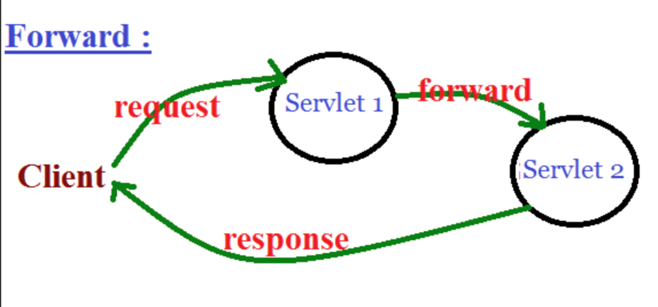 Servlet1에게 요청을 보냄Servlet1은 요청을 처리한 후, 그 결과를 HttpServletRequest에 저장Servlet1은 결과가 저장된 HttpServletRequest와 응답을 위한 HttpServletResponse를 같은 웹 어플리케이션 안에 있는 Servlet2에게 전송(forward)Servlet2는 Servlet1으로 부터 받은 HttpServletRequest와 HttpServletResponse를 이용하여 요청을 처리한 후 웹 브라우저에게 결과를 전송redirect url이 변경된다.forward url이 변경되지 않는다.FrontServlet.java