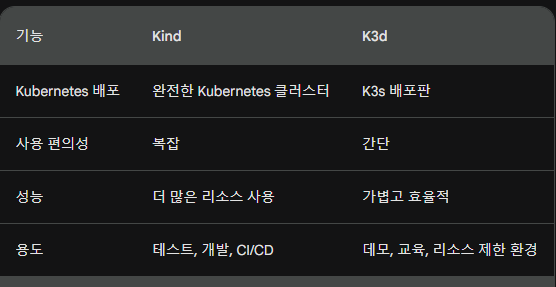 Kind (Kubernetes in Docker)와 K3d (K3s in Docker)는 모두 로컬에서 Kubernetes 클러스터를 실행하는 데 사용되는 도구이지만 몇 가지 주요 차이점이 있음.