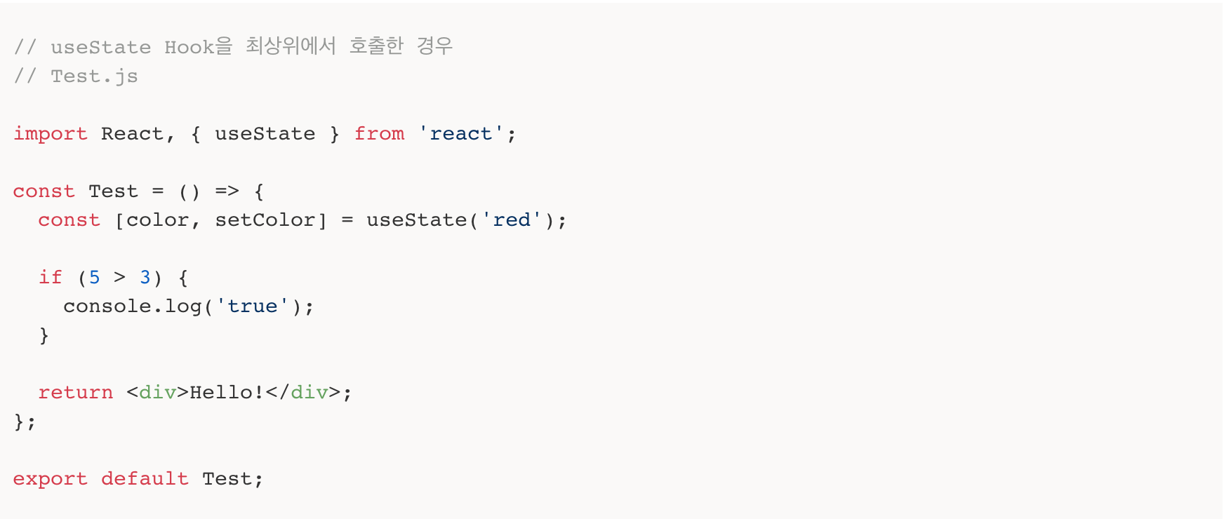 React에서 Hook을 구분할 수 있는 유일한 정보는 Hook이 사용된 순서기 때문에 최상위에서 호출해야한다.