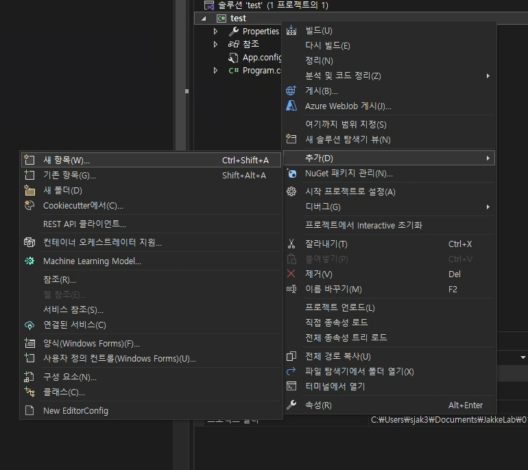 이제 객체를 다 만들었으니 객체를 만들고 필요한 기능을 사용해 봅시다. 코드를 한곳에 계속 모아두지 않고 가독성을 좋게 하도록 별도의 파일로 구분해서 만들어 줍니다. 프로젝트를 우클릭하여 추가 > 새 항목으로 들어갑니다.