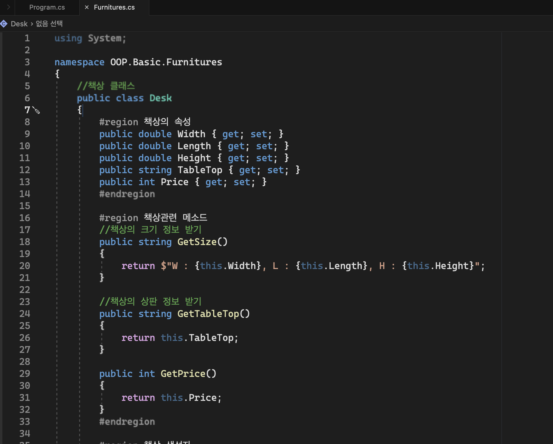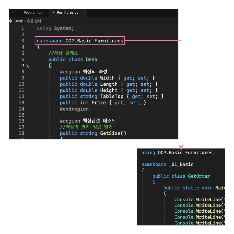 그리고 클래스를 정의한 부분은 Furnitures.cs에 옮겨둡니다.