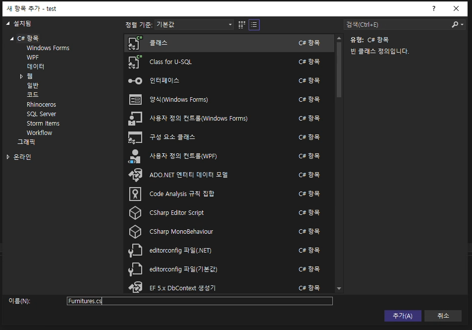 여기서 클래스를 선택하고 원하는 이름으로 입력하여 추가를 합니다. 저는 Furnitures로 했습니다.