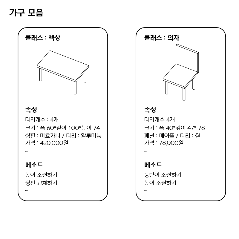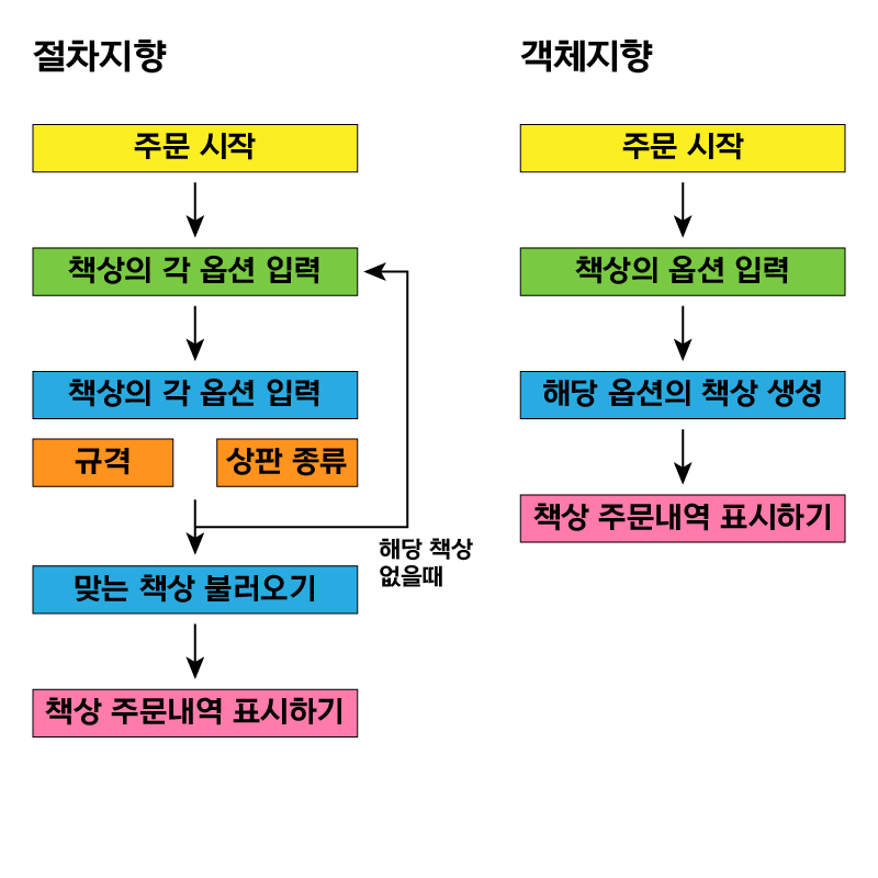반대로 객체지향으로 구현할 때는 각기 다른 책상을 따로 정의할 필요 없이 책상이라는 공통된 항목을 하나 정의해서 주문서의 요구에 따라 옵션을 바꾸는 것으로 간단하게 해결이 됩니다.