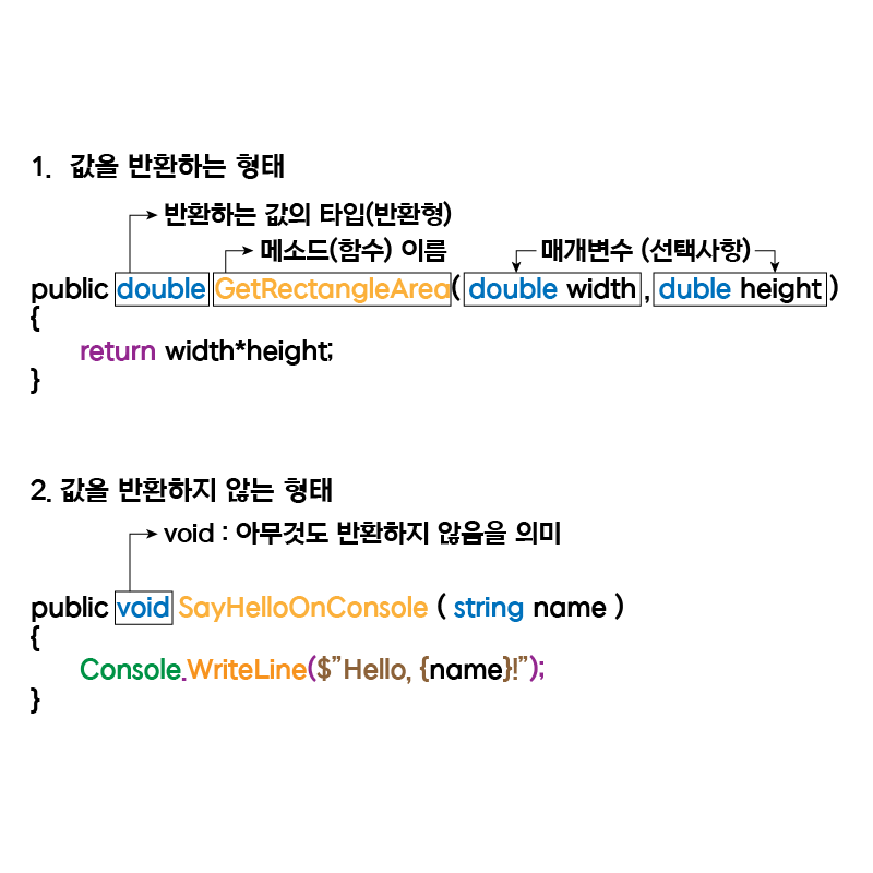 여기서 반환형은 크게 string, int, double, bool, 클래스이름 등이 될 수 있습니다. 그리고 함수는 꼭 값을 반환하지 않아도 되며, 값을 반환하지 않는 함수는 void를 반환형 자리에 적어둡니다. 값을 반환하는 함수일 경우, 코드를 종료할 부분에 return {변수}; 를 붙여서 어떤값을 반환하고 종료한다는 것을 명시해야 합니다.