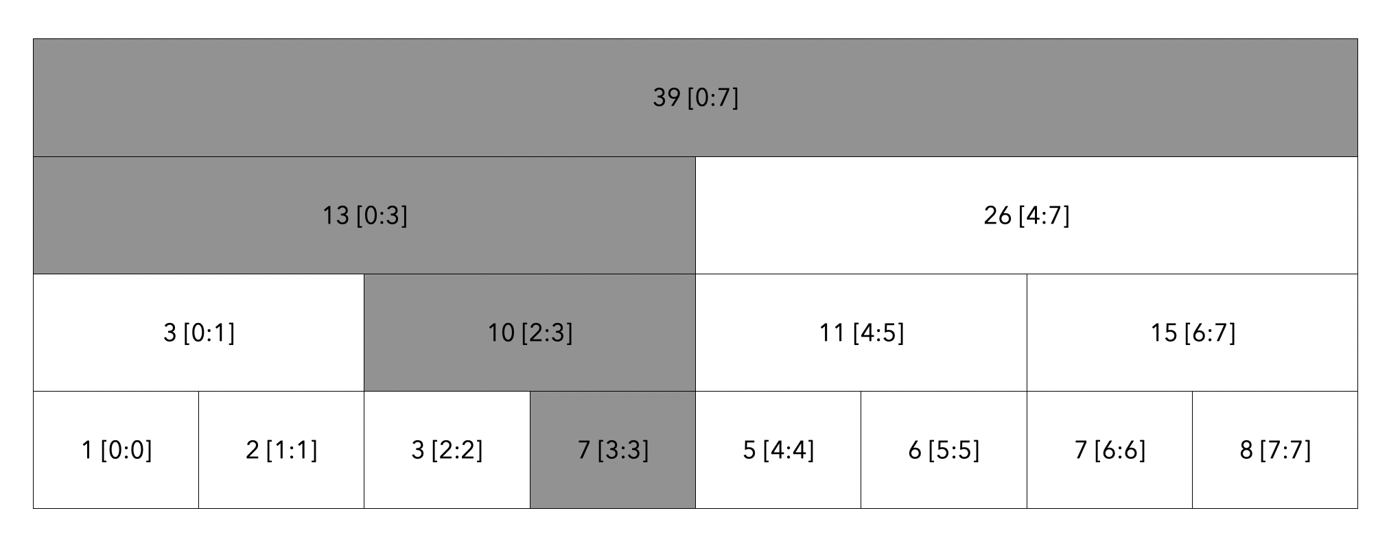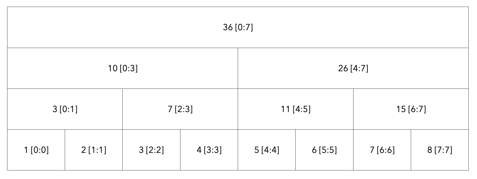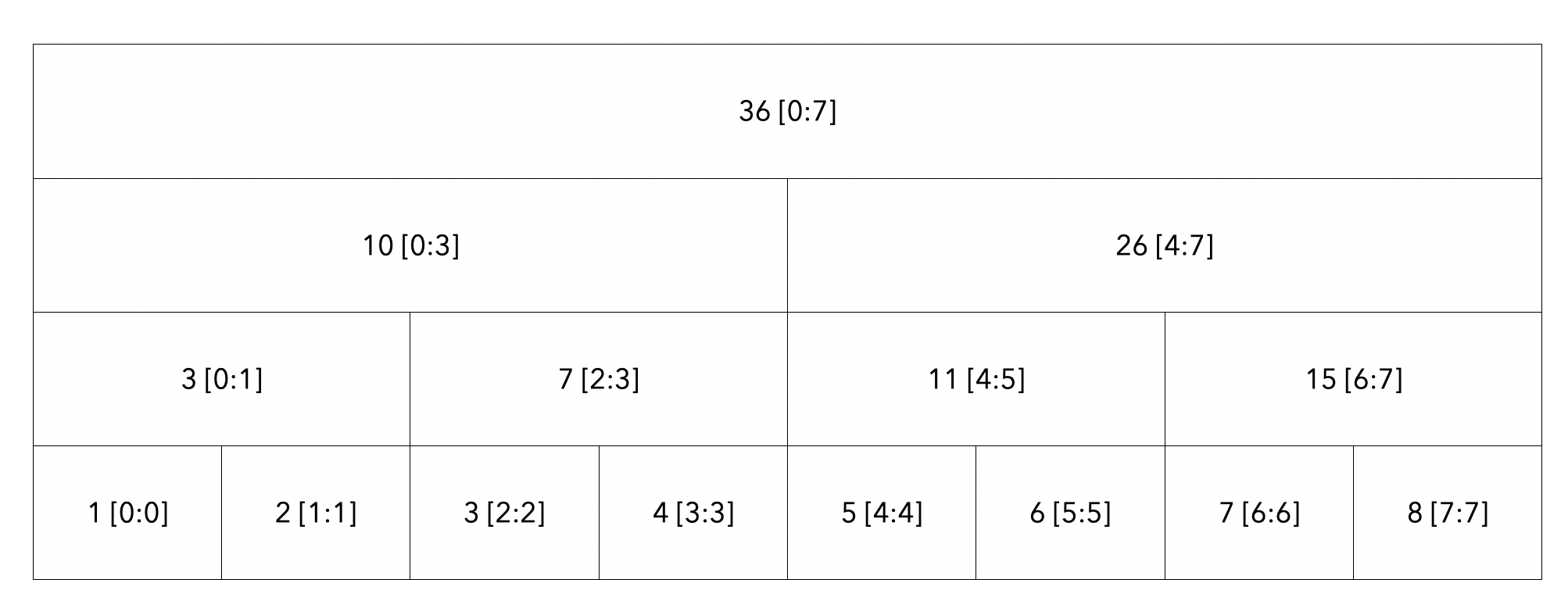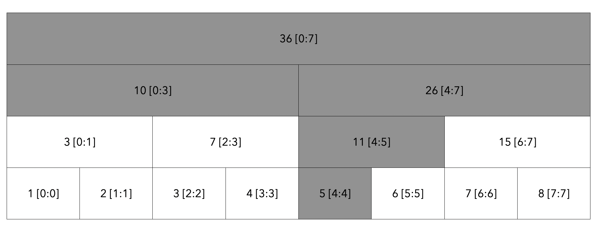 탐색한 모든 노드의 값인 10[0:3] + 5 [4:4]를 더하여 15라는 결과를 도출하게 됩니다.