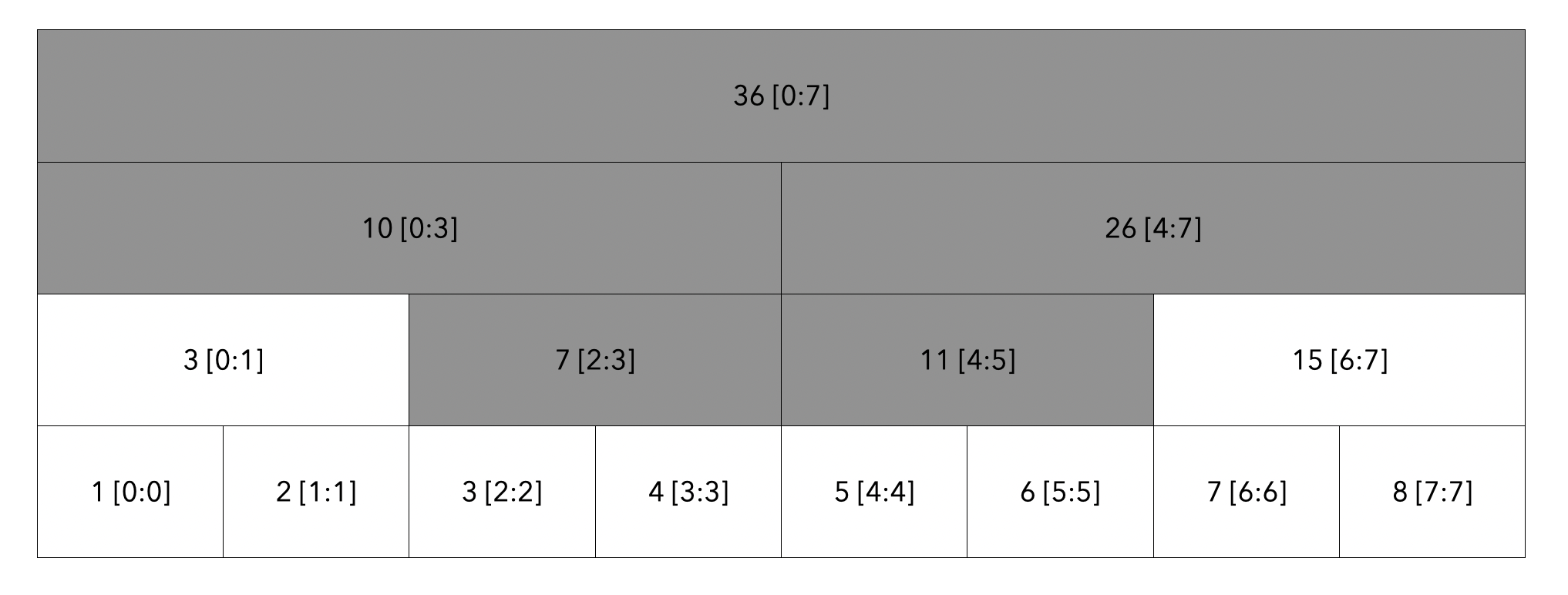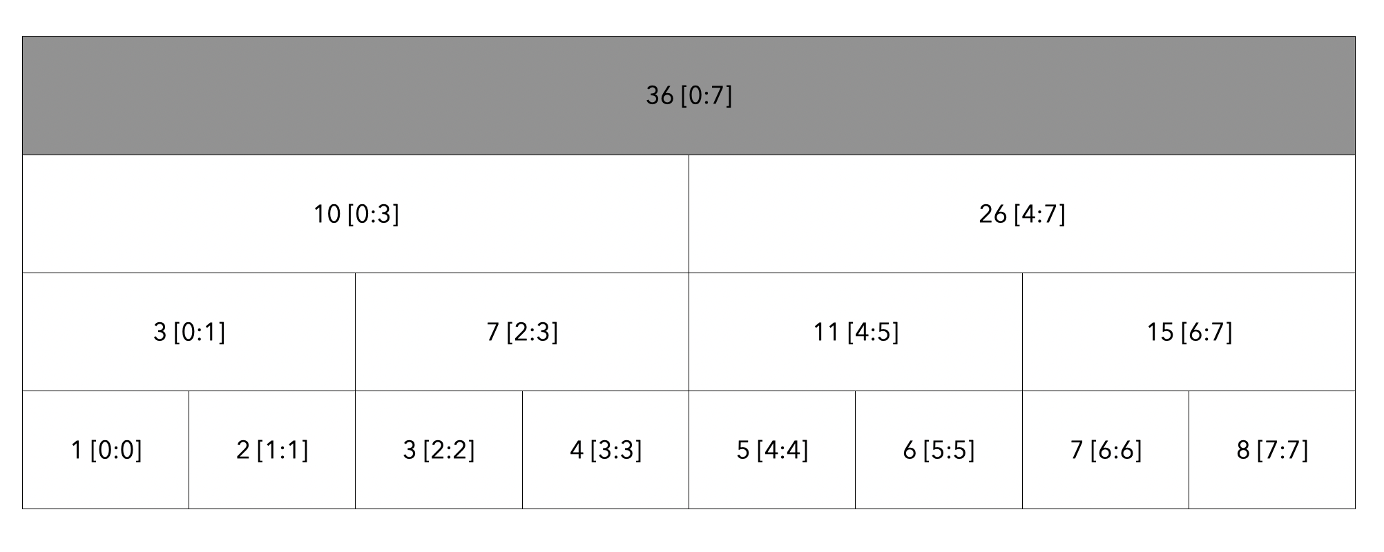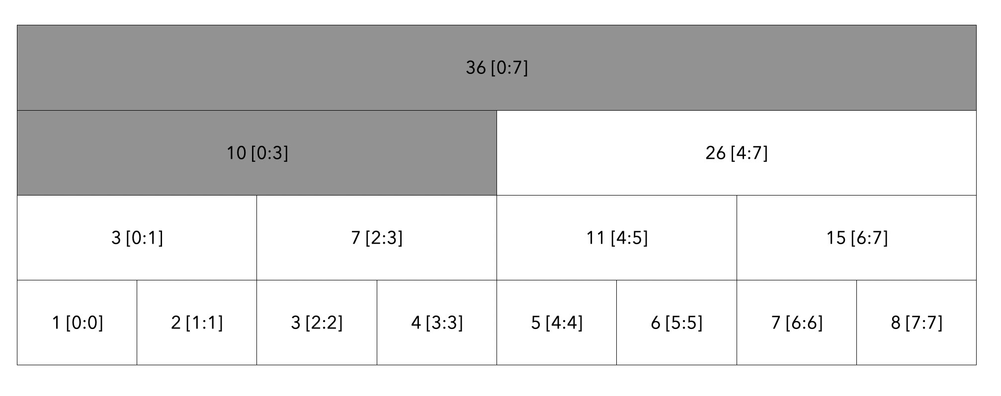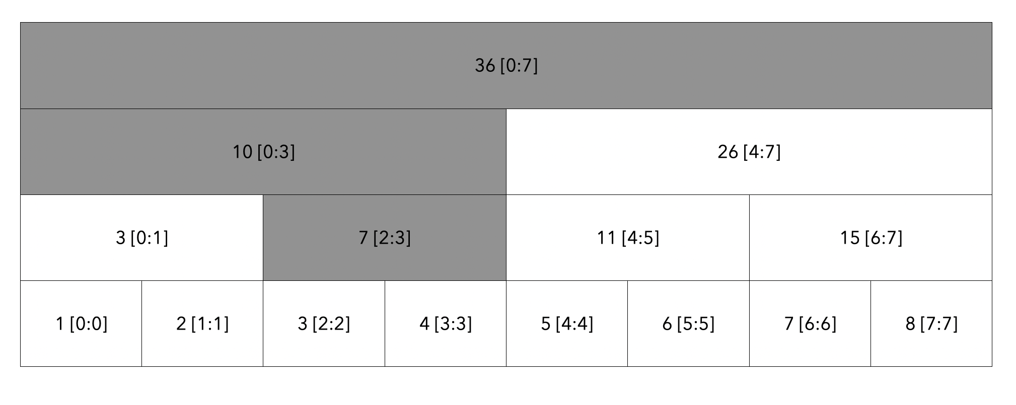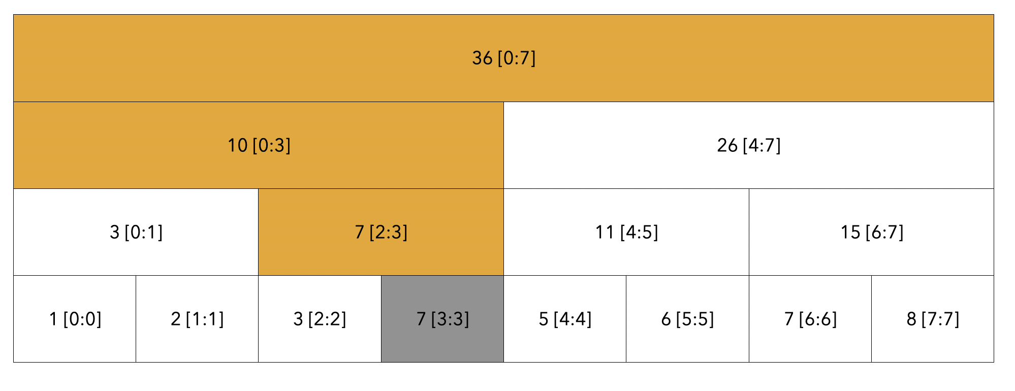 루트 노드부터 탐색합니다. 탐색할 범위는 [2:5]이고 현재 노드의 범위는 [0:7]이므로 자식 노드로 내려갑니다.