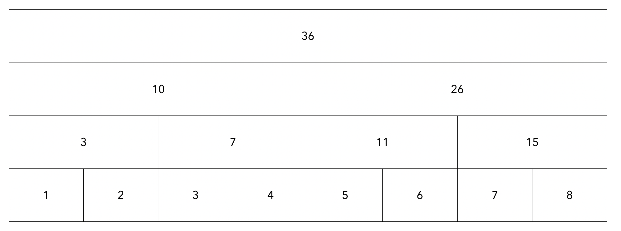세그먼트 트리는 위와같이 구성됩니다. 가장 아래에 위치한 노드는 배열의 값과 동일하며 부모노드는 자식노드의 합을 가져 각 노드는 배열의 특정 구간의 합으로 구성되어 있습니다.