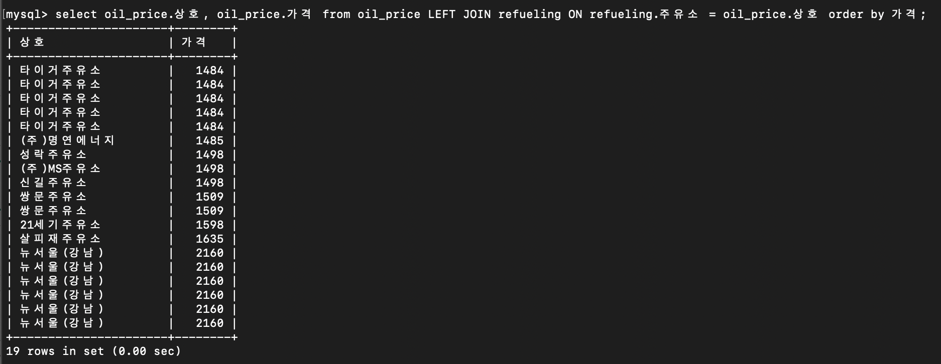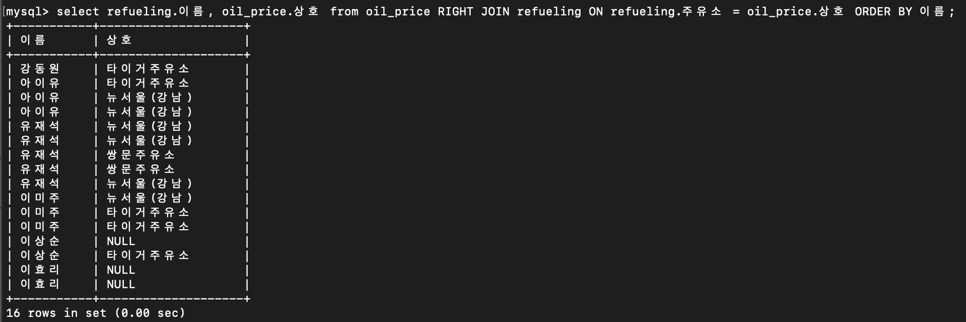 ON refueling.주유소 = oil_price.상호 ORDER BY 이름;
