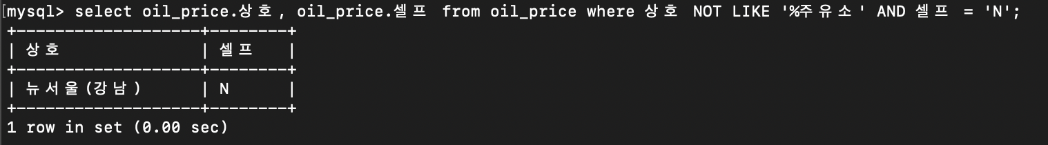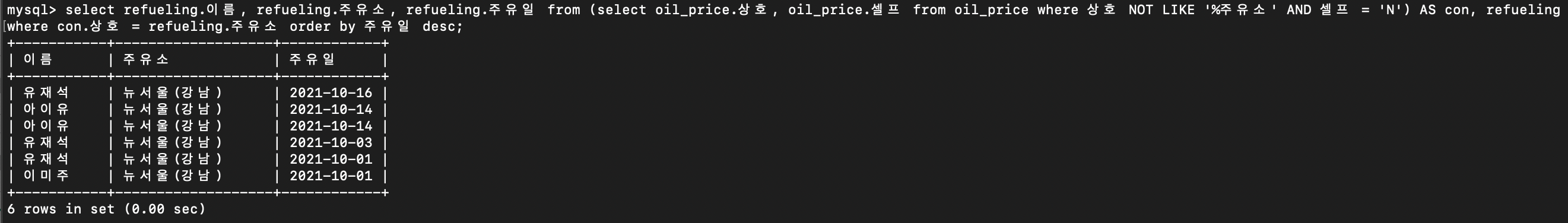 from (select oil_price.상호, oil_price.셀프 from oil_price where 상호 NOT LIKE '%주유소' AND 셀프 = 'N') AS con, refueling