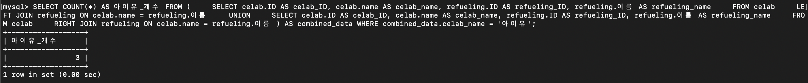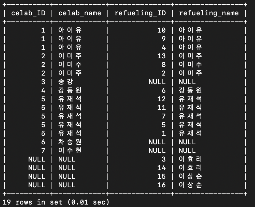 (SELECT celab.ID AS celab_ID, celab.name AS celab_name, refueling.ID AS refueling_ID, refueling.이름 AS refueling_name