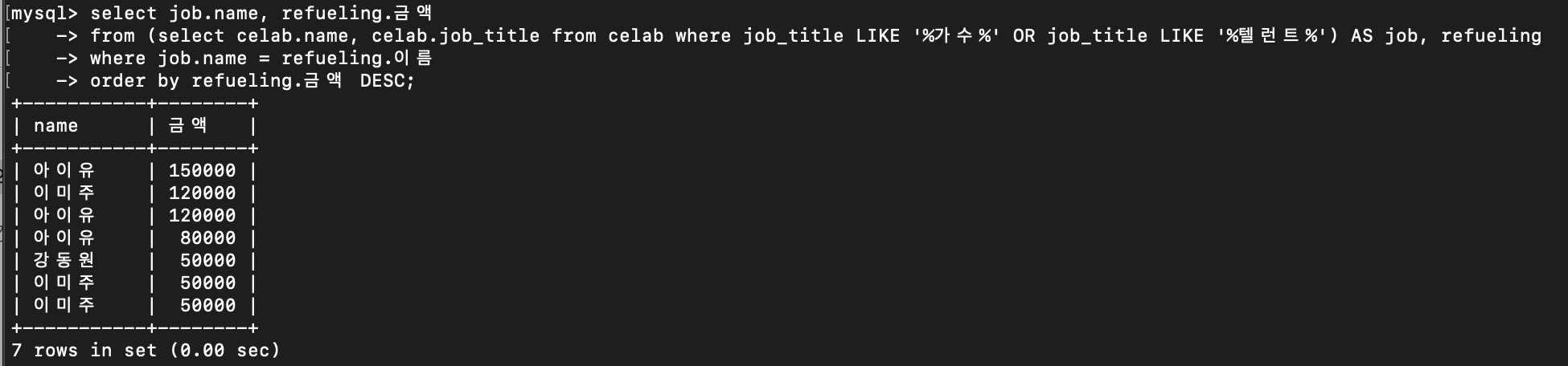 from (select celab.name, celab.job_title from celab where job_title LIKE '%가수%' OR job_title LIKE '%텔런트%') AS job, refueling