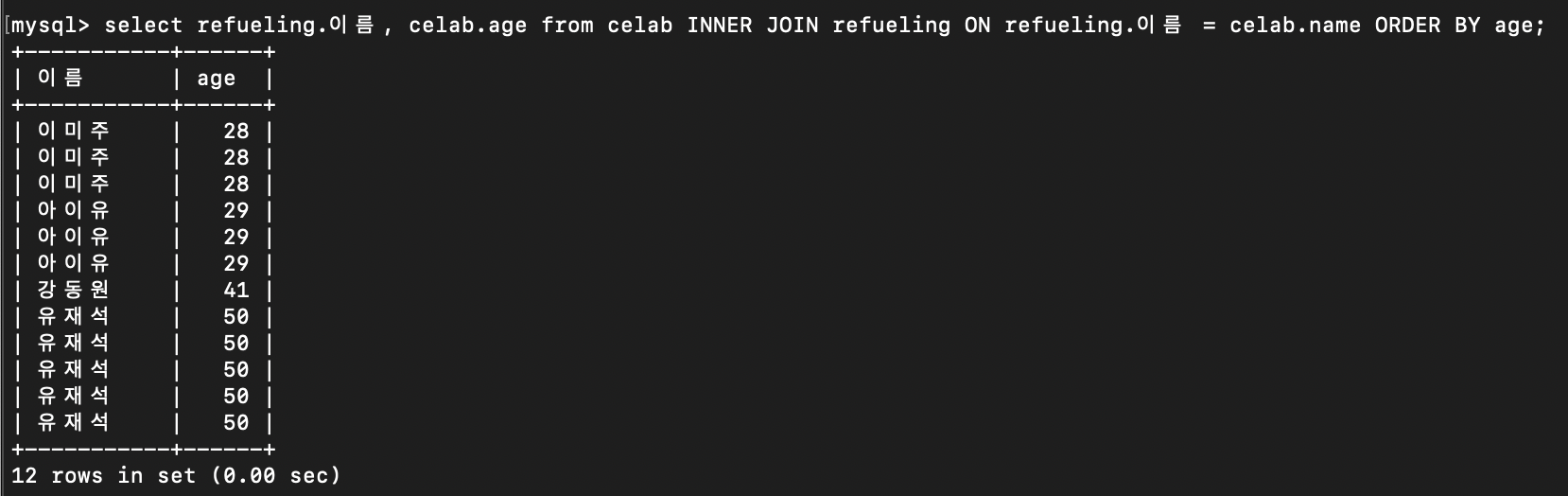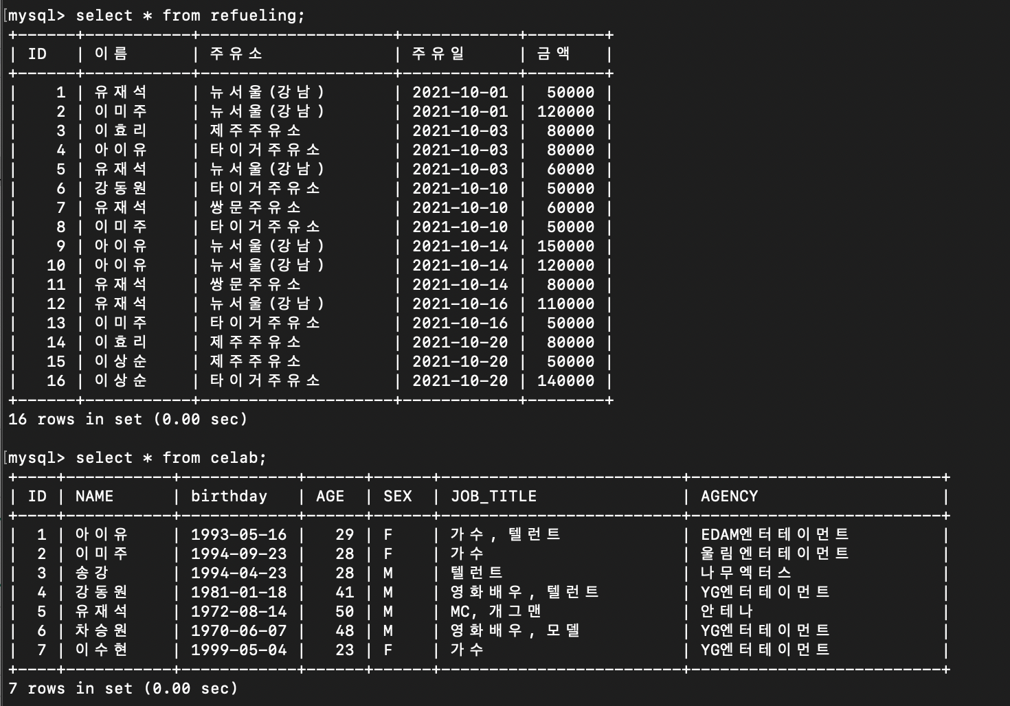 SELECT celab.ID AS celab_ID, celab.name AS celab_name, refueling.ID AS refueling_ID, refueling.이름 AS refueling_name