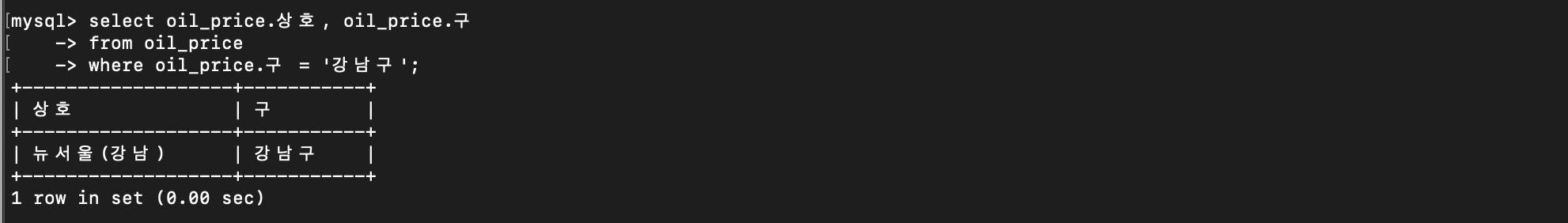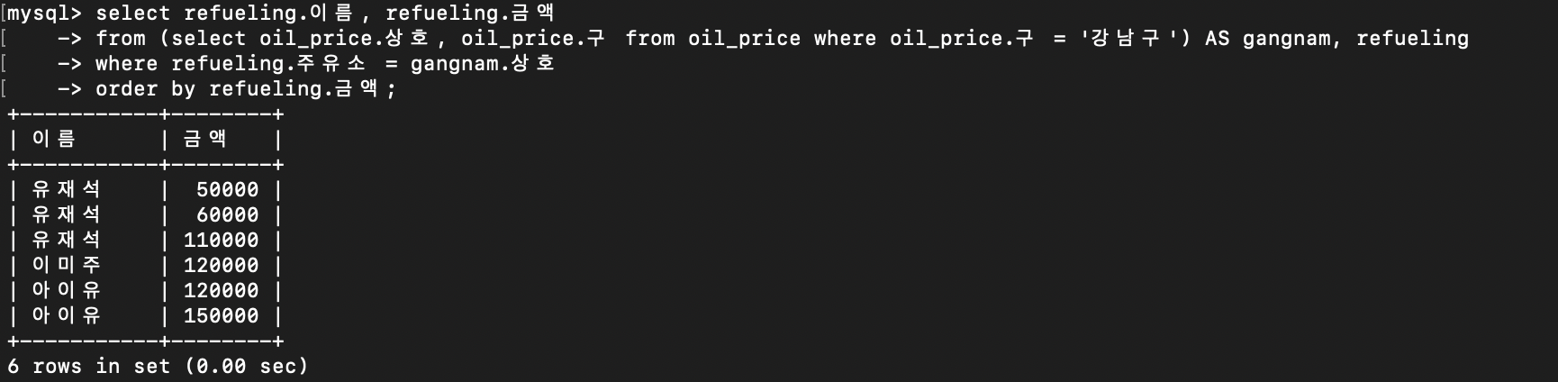 from (select oil_price.상호, oil_price.구 from oil_price where oil_price.구 = '강남구') AS gangnam, refueling