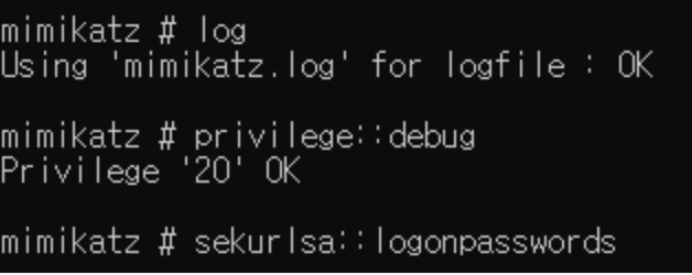 Sekurlsa 모듈의 명령어 사용시 메모리에서 비빌번호 덤프 가능