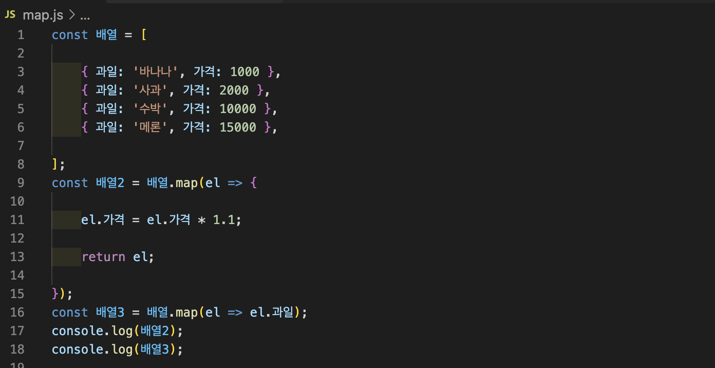 map 메소드는 배열의 요소를 모두 변경 하는 경우, 객체의 map 메소드를 활용한다. 콜백 함수를 인자로 받아, 콜백 함수의 return으로 반환되는 값들을 새로운 배열에 만들어요. 먼저 예제를 확인해볼게요.