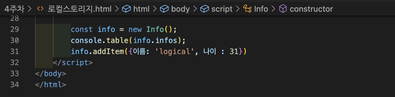 Info 클래스 생성하고 함수에서 로컬스토리지를 이용하여 주어진 키에 해당하는 문자열을 호출합니다. 로컬스토리지의 getItem 메소드는 특정키에 해당하는 문자열을 가지고 있습니다.