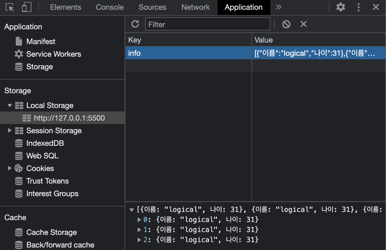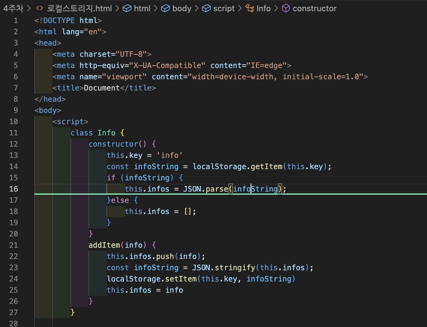Info 클래스에 addItem 메소드를 정의하고, 주어진 info 객체를 infos 배열에 추가하고 해당 배열을 JSON.stringify를 이용하여 JSON 문자열로 만들어 줍니다. 그리고 로컬스토리지의 setItem 메소드를 이용하여 JSON 문자열을 추가합니다. 이후 로컬스토리지에는 info 키로 JSON 문자열이 추가 됩니다.