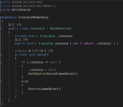 이 방식은 유니티에서 가장 쉽게 구현할 수 있는 싱글톤 방식중에 하나이다.