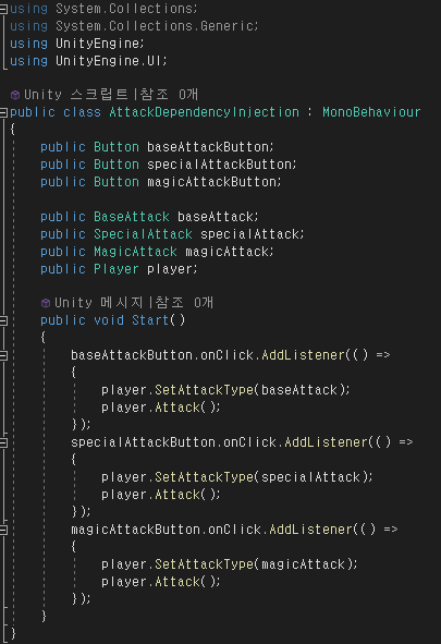 BaseAttack Button을 눌렀을 땐 baseAttack이 출력되고, SpecialAttack Button을 눌렀을 땐 Special Attack이 출력되며, MagicAttack Button을 눌렀을 땐 MagicAttack이 출력되는 형식의 코드이다.