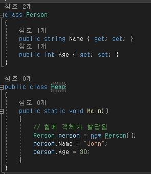 해제 : 힙에서 할당된 메모리는 자동으로 해제되지 않는다. C#에서는 가비지 컬렉션(GC)이 불필요한 객체를 자동으로 수거하여 메모리를 해제한다. 가비지 컬렉터는 객체가 더 이상 사용되지 않을 때, 즉 참조가 끊어졌을 때 해당 메모리를 회수한다.