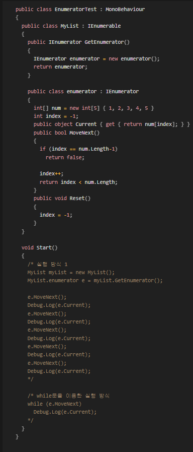 C#에서 IEnumerator 인터페이스를 이용해서 구현할 수 있다.