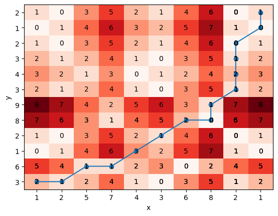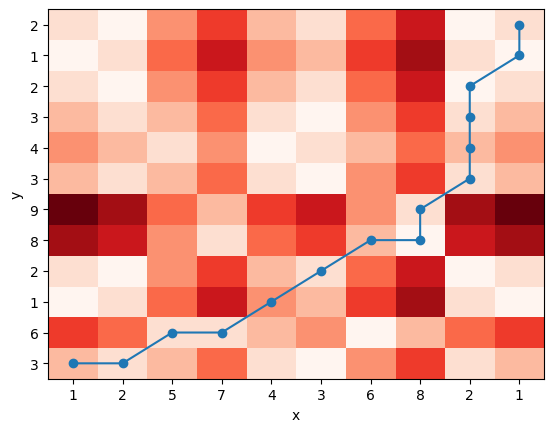 cost, heatmap, path, dtw_distance = dtw_distance(x, y, distance)