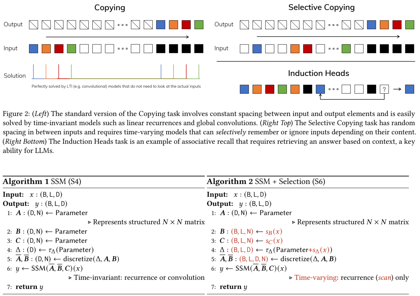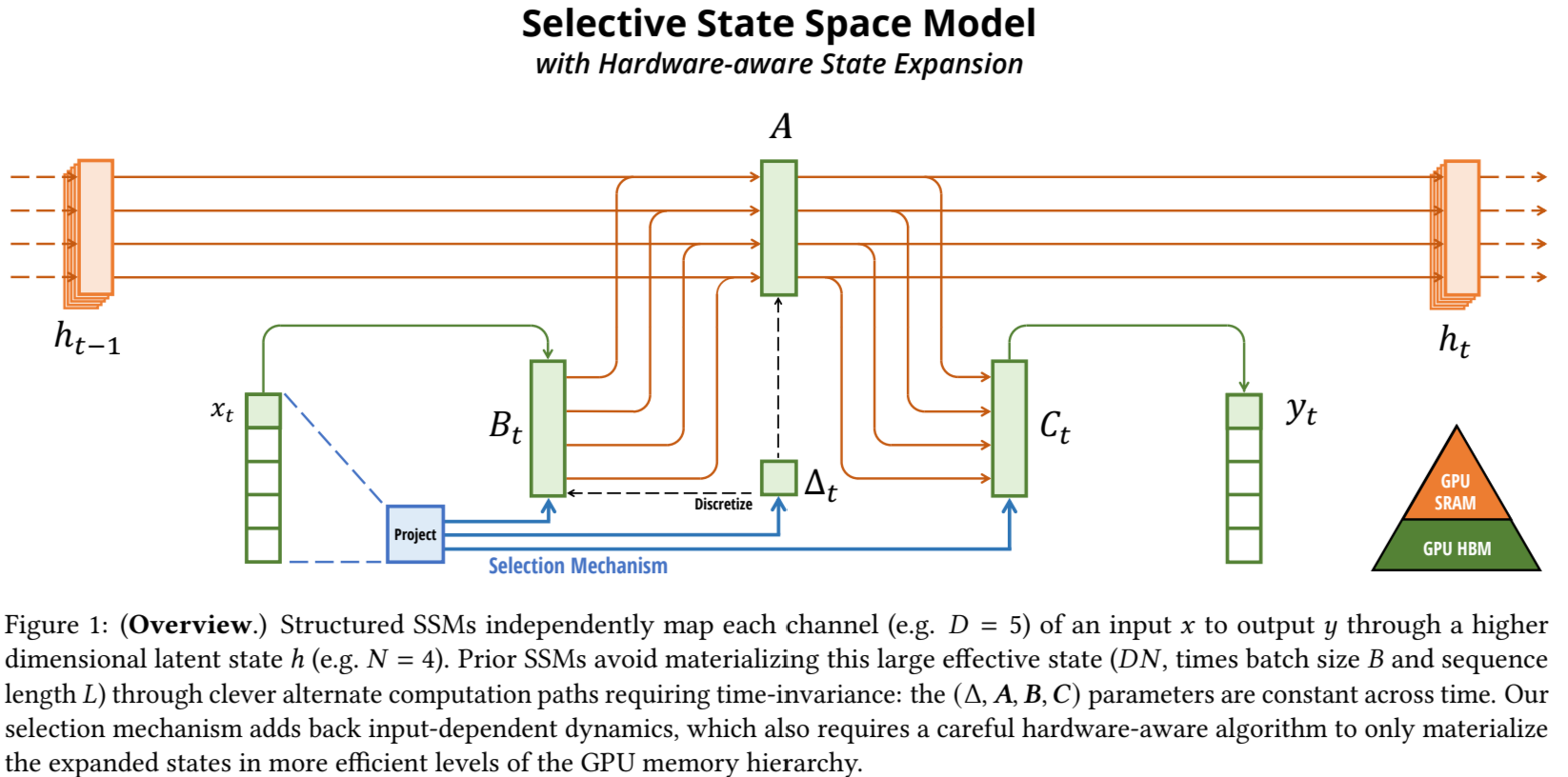 Foudnation Model은 Transforemr 아키텍처와 core attention module을 기반으로 만들어 졌으며,현재 DL에서 강력하게 응용되고 있다. 많은 subquadratic-time 아키텍처는 long sequance에 대한 Transformer 연산의 비효율성을 다룰때 사용되지만, language과 같이 중요한 모달에서는 attention만큼 좋은 성과를 내지 못한다. 이 논문에서는 모델의 주요 취약점인내용 기반(content based) 추론을 수행할 수 없다는 것을 확인하였고 여러가지를 개선했다. 첫 번쨰로, 단순히 SSM 매개변수를 입력의 함수로 두는 것만으로 개별 양식으로의 취약점을 해결하여 모델이 현재 토큰에 따라 시퀀스 길이 차원을 따라 정보를 선택적으로 전파하거나 잊어버릴 수 있다. 둘 때는, 이러한 변화는 효율적인 convolution을 사용할 수 없음에도 불구하고 반복 모드(recurrent mode)에서 하드웨어 인식 병렬 알고리즘을 설계했다. Selective SSM을 simplified end-to-end neural network 아키텍처를 attention 또는 MLP blocks 없이 통합했다. Mamba는 Transformer보다 5배는 높은 성능으로 추론을 하고, linear scaling과 million-lengh 길이를 다룰 때 성능을 개선했다. 일반적인 sequence model의 백본처럼, Mamba는 SOTA의 성능으로 언어, 오디오, 유전체(genomics) 모달에서 보였다. Language modeling에서 Mamba 3B model은 같은 크기의 Transformer의 성능을 뛰어넘고, 사전학습 및 다운스트림 평가에서 Transformer와 크기가 두배 일치한다.(?)