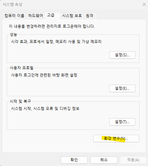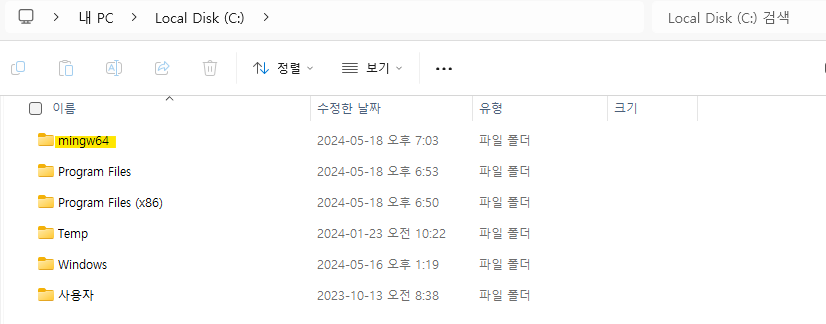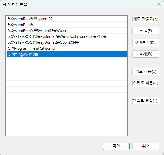 04 win+R > sysdm.cpl > 고급 > 환경 변수 > 시스템 변수 > Path > 편집> 새로 만들기 > C:\mingw64\bin