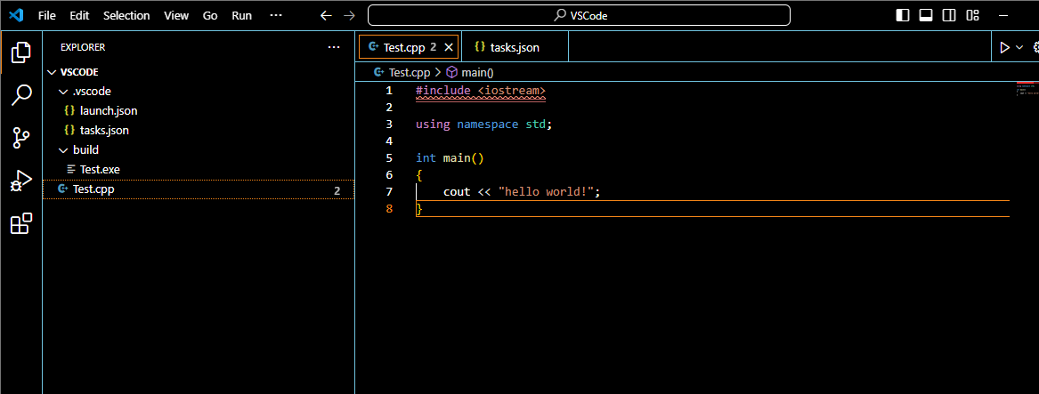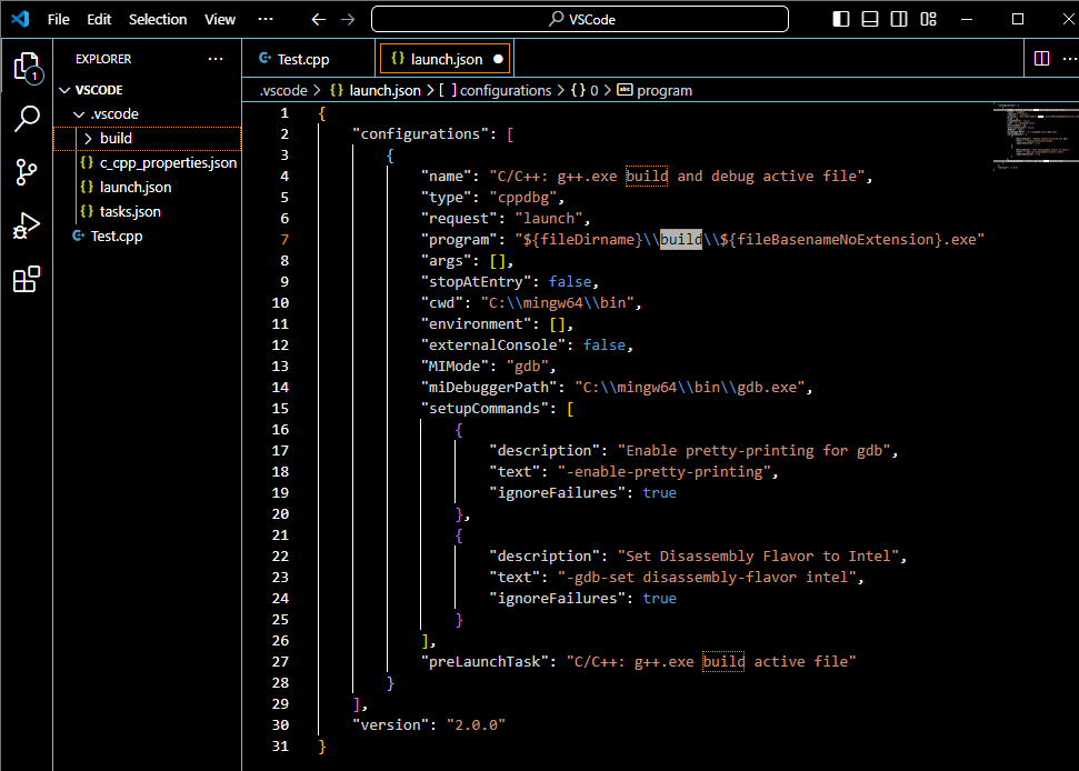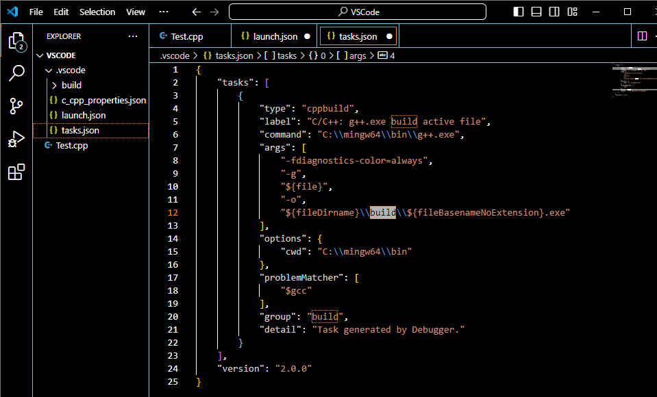 07 launch.json과 taks.json이 .vscode폴더에 새로 생성된다. 이때, build 전용 디렉토리를 추가해서, .exe파일이 특정 경로에 생성되도록 한다. 이때, "${fileDirname}\${fileBasenameNoExtension}.exe" 사이에 build 문구 추가한다.