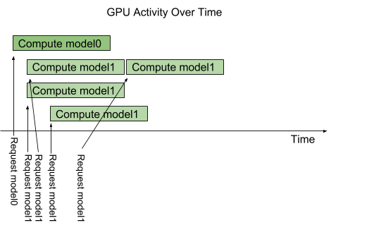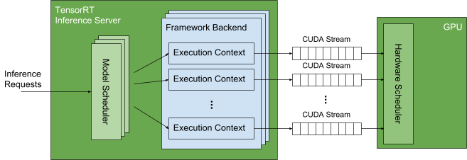 - request -> Model Scheduler (== ingress controller)에 큐잉됨 -> 해당 요청에 맞는 모델과 연관된 Execution Context에 전달 -> 이와 연관된 CUDA stream으로 모델 실행에 필요한 memory-copy와 kernel execution 전달 (CUDA stream은 독립적)-> GPU 하드웨어 스케줄러가 이를 받아서 수행