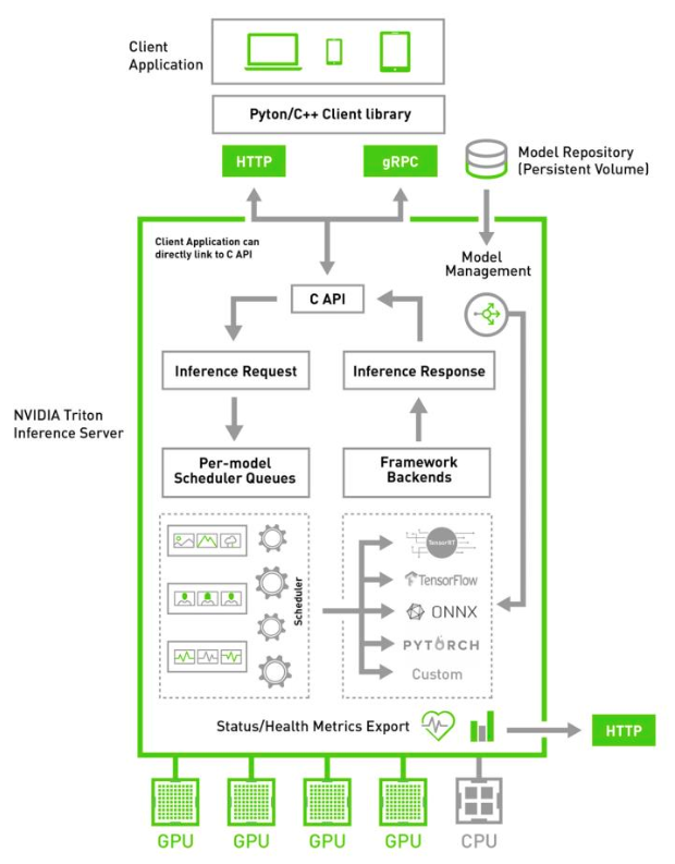 - Triton Server가 GPU 할당 및 사용에 이용됨