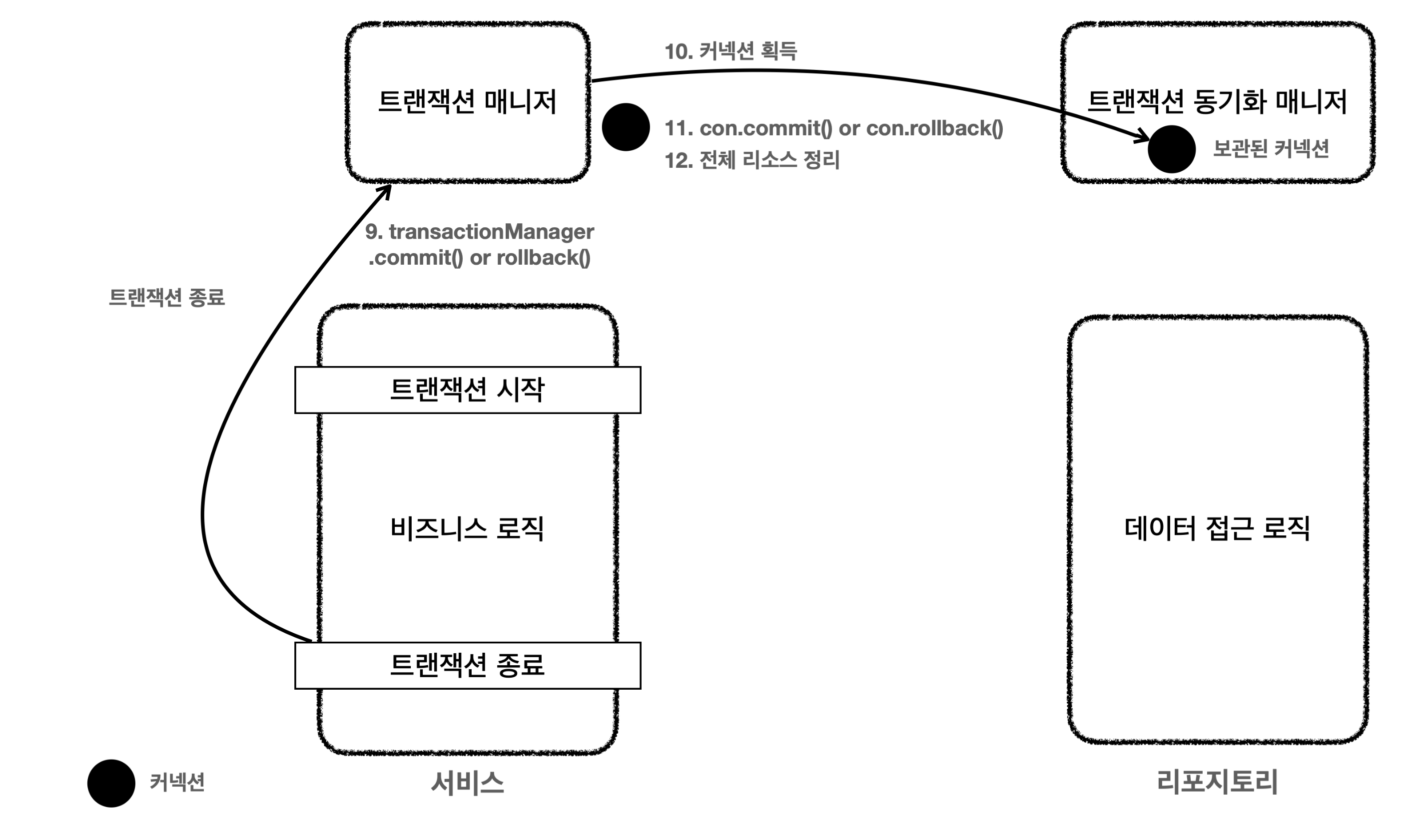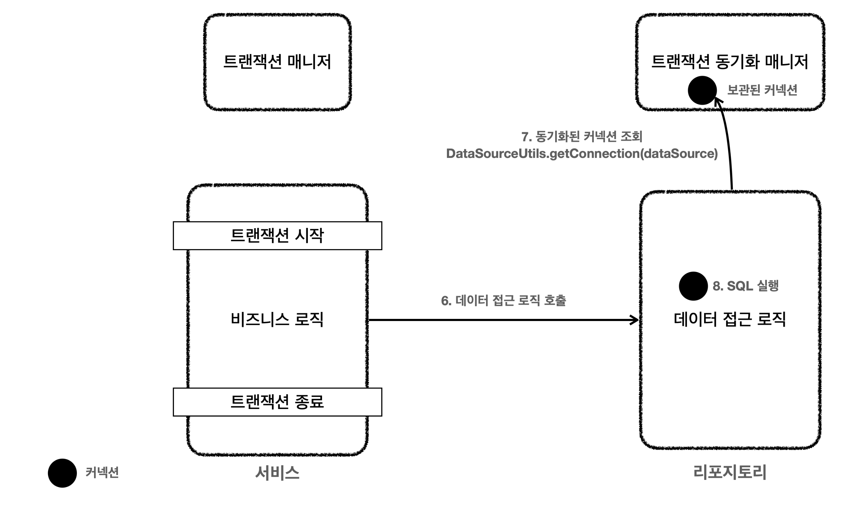 트랜잭션을 유지하려면 트랜잭션의 시작부터 끝까지 같은 데이터베이스 커넥션을 유지해야 한다.
