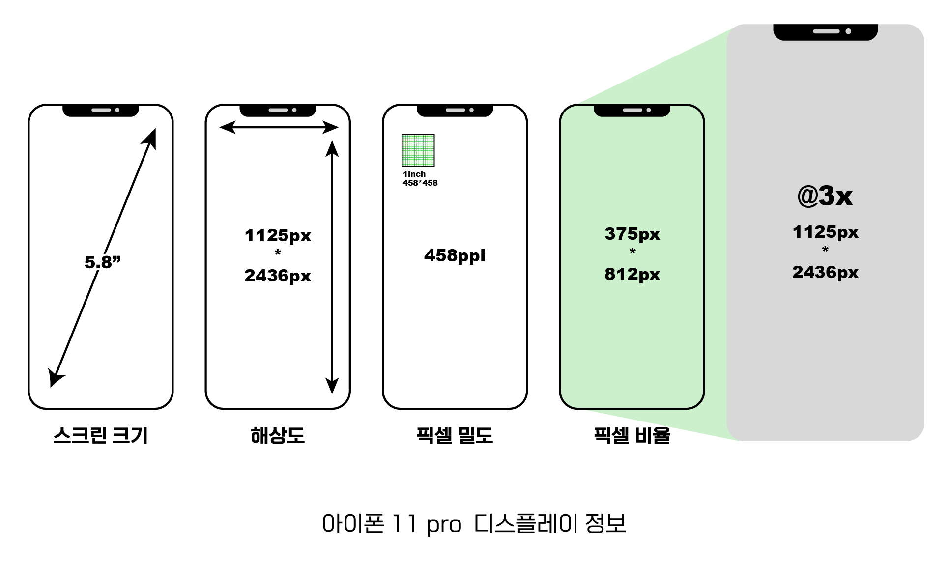 아이폰 11 pro는 실제로 보여지는 픽셀인 375px x 812px에서 더 선명한 화면으로 보이기 위해 3배 더 큰 1125px x 2436px을 축소시켜 고밀도화했다. (여기사 3배가 픽셀 비율이 됨)
