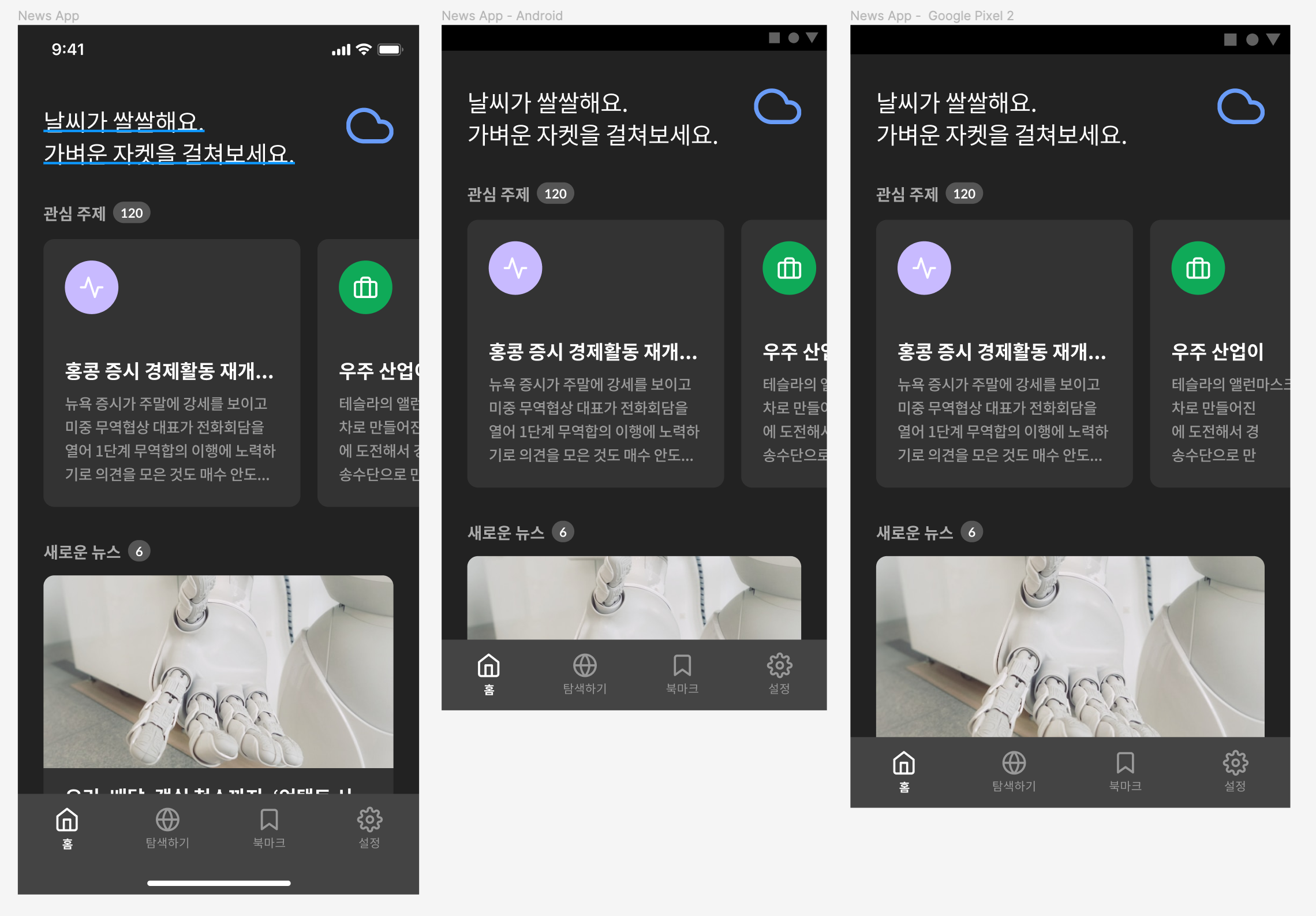 상단에는 가로 스와이프해 살펴볼 수 있는 '관심 주제'의 뉴스가 있고, 하단에는, 세로 스크롤해 보는 '새로운 뉴스'가 있다. 서로 방향이 다른 가로 스와이프와 세로 스크롤 특징들을 유의하며 뉴스 영역을 디자인해야 한다.
