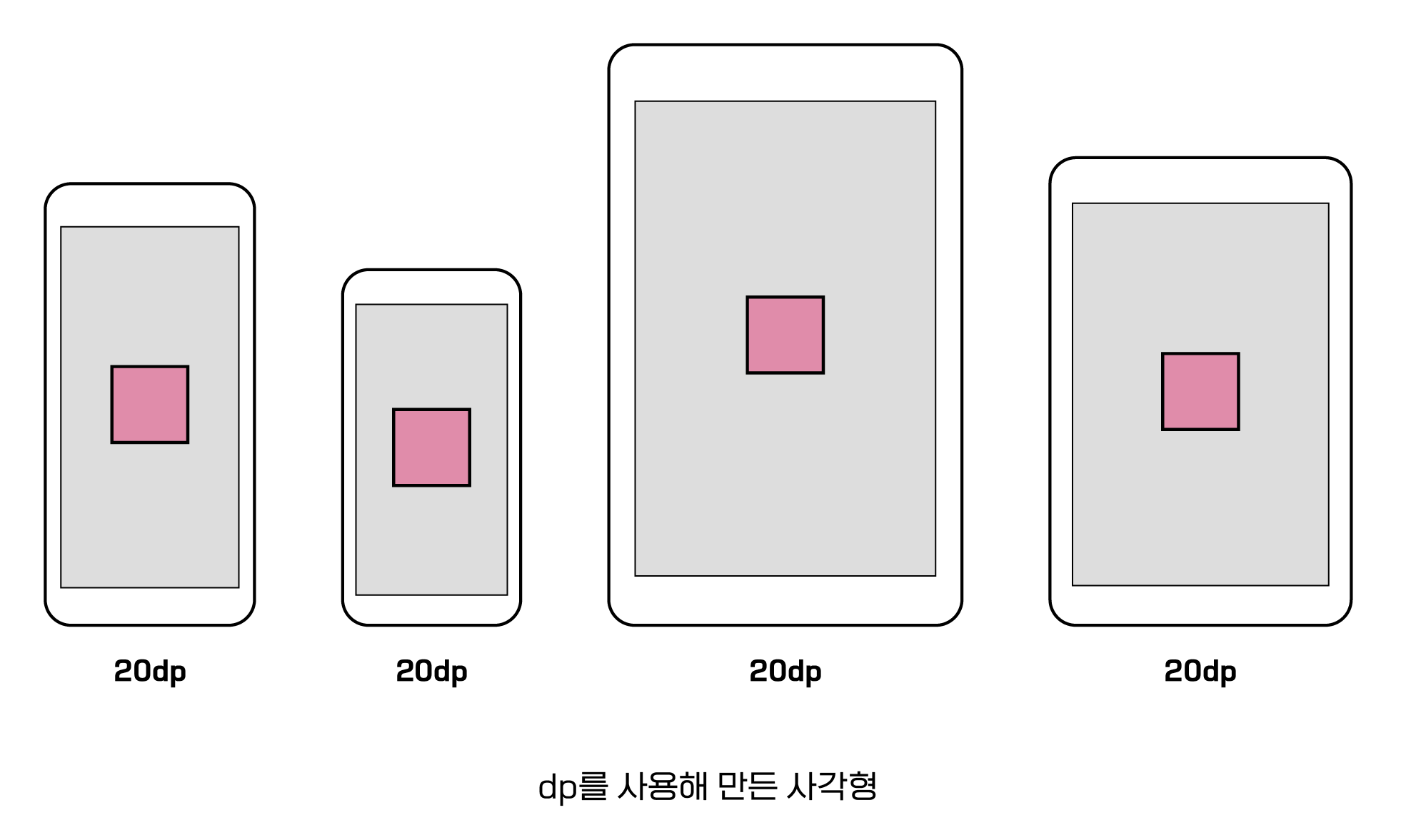 예를 들어 20dp x 20dp(20pt x 20pt)로 그려 넣으면 이 단위가 화면 밀도를 자동으로 계산해 해상도가 낮은 화면에서도, 높은 화면에서도 결국에는 같은 크기로 보인다. (여기서 절대적인 값인 픽셀(pixel)을 사용해 20px x 20px를 그려 넣으면, 해상도가 낮은 디바이스에서는 무난하게 보일지 몰라도 해상도가 높은 디바이스에서는 훨씬 작게 보일 것.)